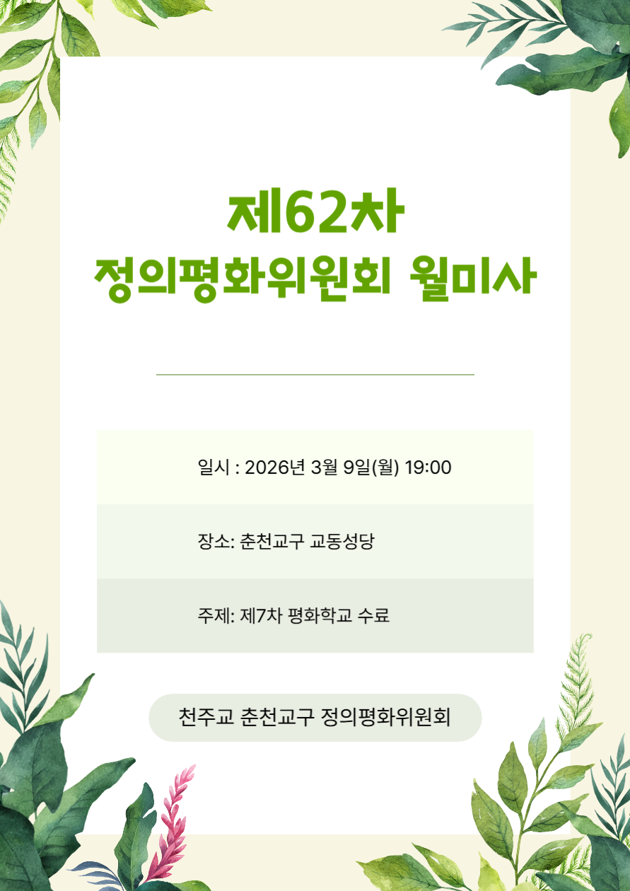 이번 월미사는 '제7차 평화학교 수료'라는 주제로 2026년 3월 9일(월) 오후 7시, 춘천교구 교동성당에서 봉헌합니다.