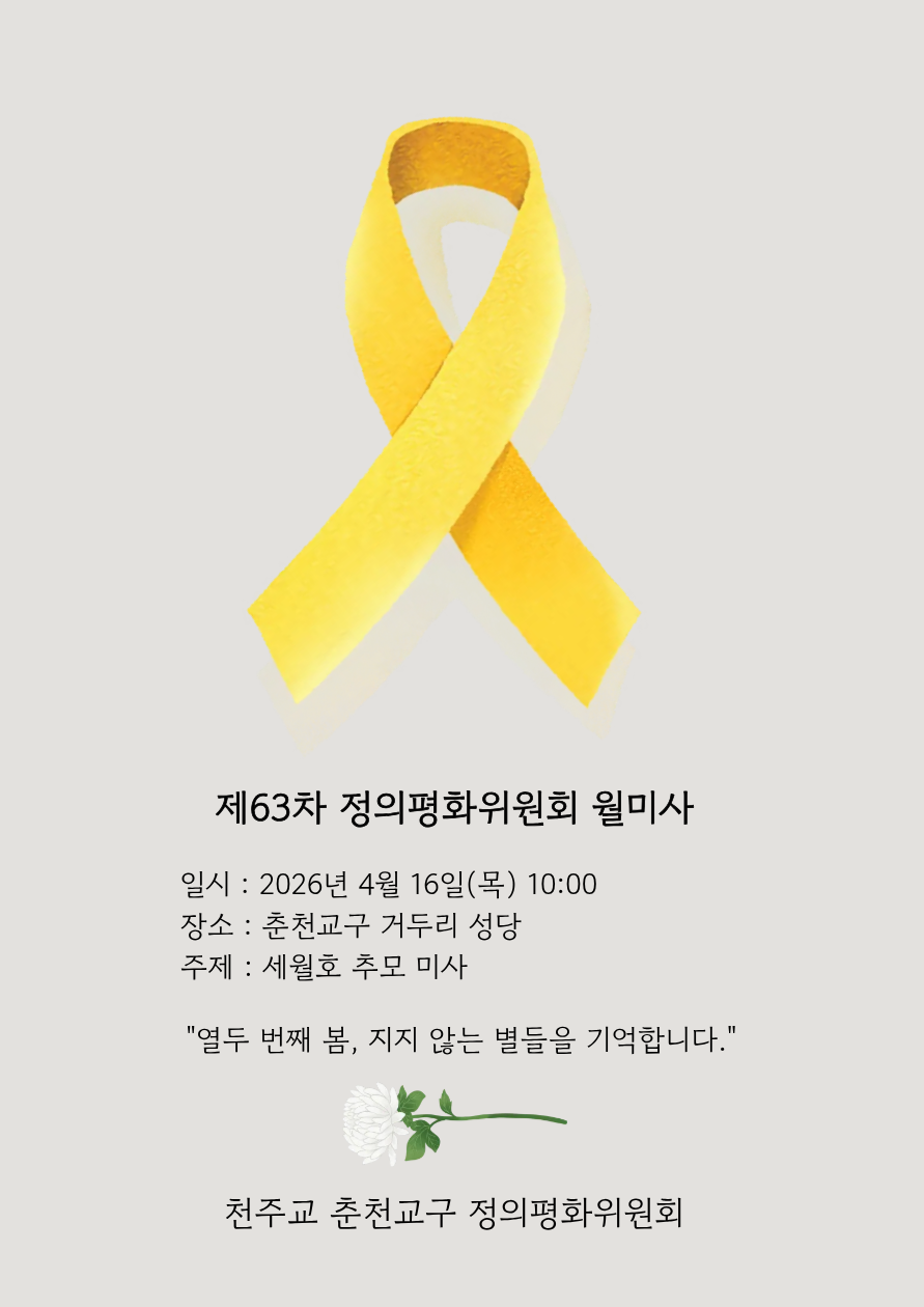 이번 월미사는 '세월호 추모 미사'라는 주제로 2026년 4월 16일(목) 오전 10시, 춘천교구 거두리 성당에서 봉헌합니다.