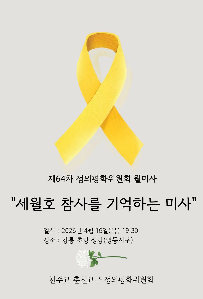 이번 월미사는 ’세월호 추모 미사‘라는 주제로 2026년 4월 16일(목) 오후 7시 30분, 춘천교구 초당 성당에서 봉헌합니다.