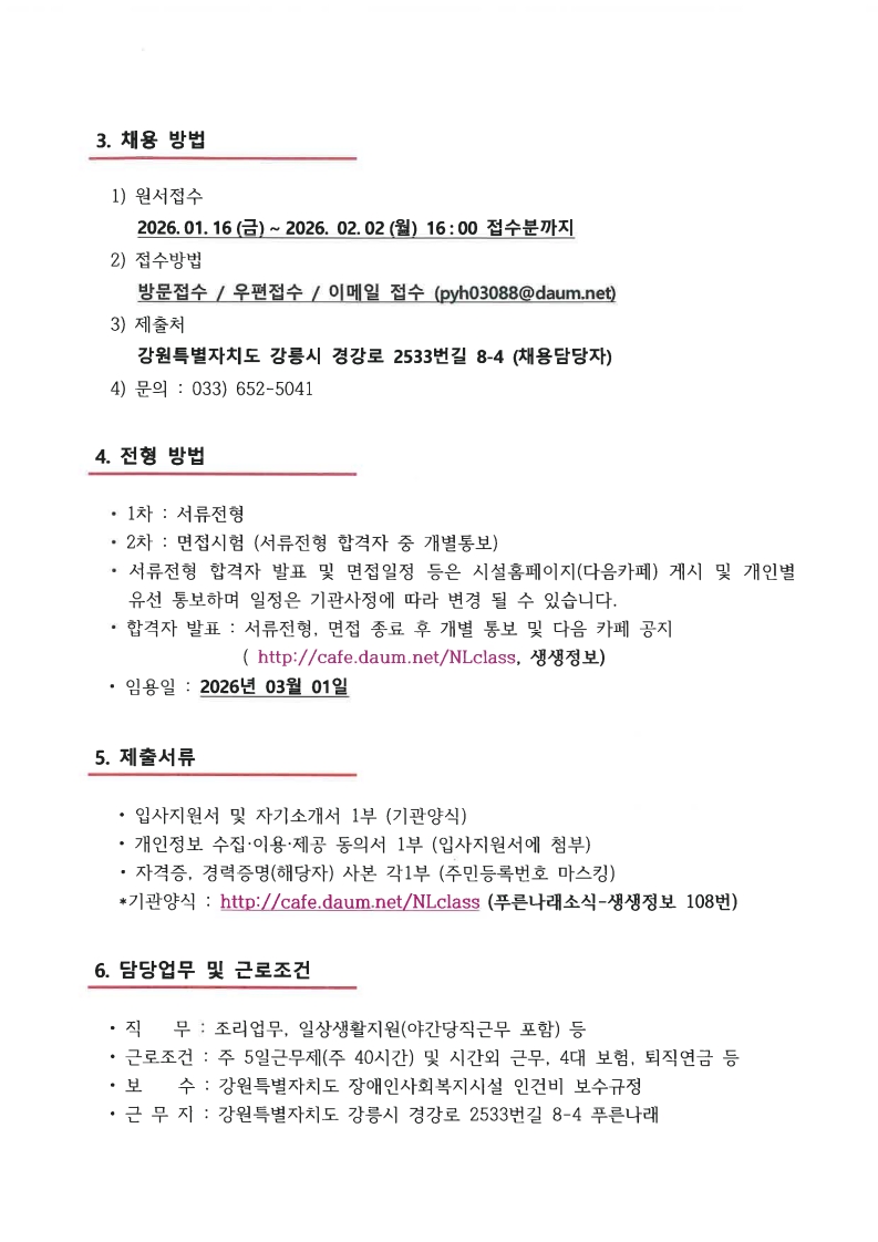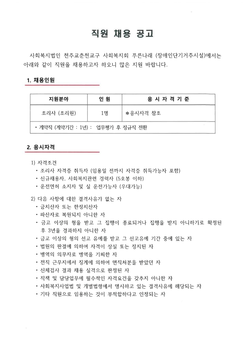 [채용중]푸른나래(장애인단기거주시설) 조리사 모집공고