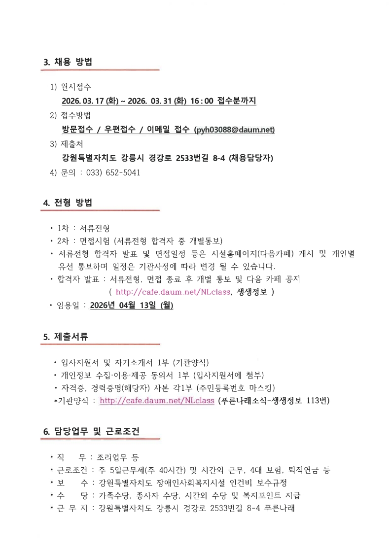 푸른나래(장애인단기보호) 조리사(조리원) 채용 재공고