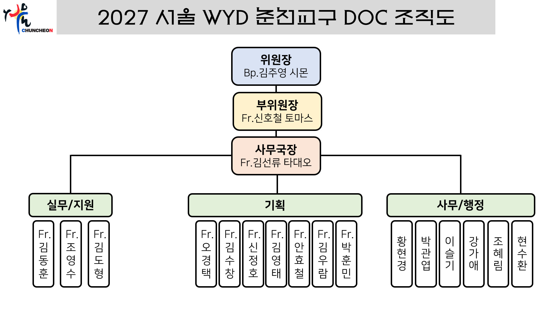 ‘2027 WYD 서울’은 2027년 7월 29일(목) ~8월 8일(주일), 10박 11일로 진행된다. 위 일정 중 서울에서의 본대회 전 4박 5일은 교구대회이다. 춘천교구 조직위원회(이하 ‘DOC’)는 이 4박 5일 간의 교구대회의 기획·준비를 위해 꾸려진 교구 내 사제와 평신도로 이루어진 단체이다.
