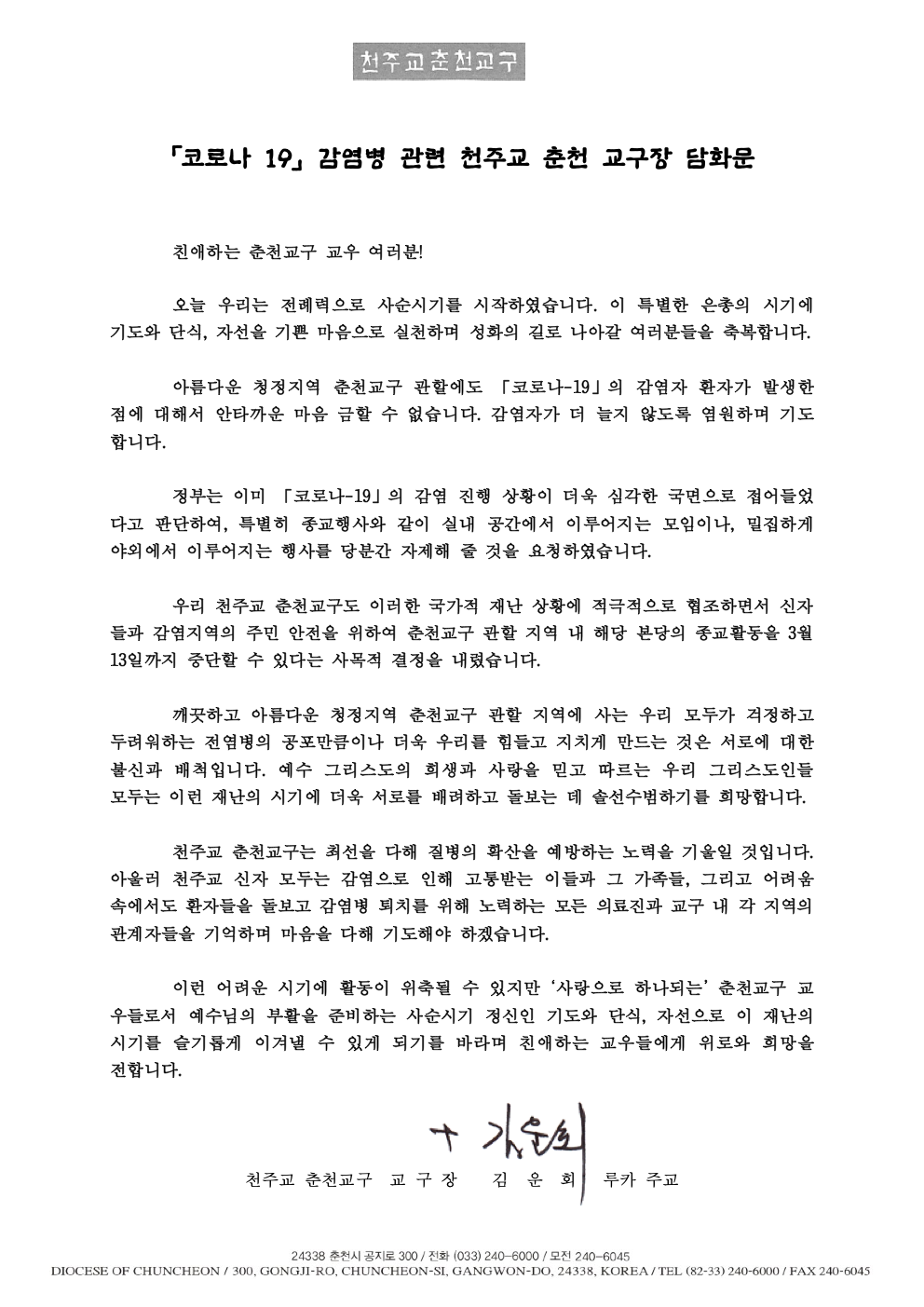 코로나19 감염병 관련 천주교 춘천교구장 담화문