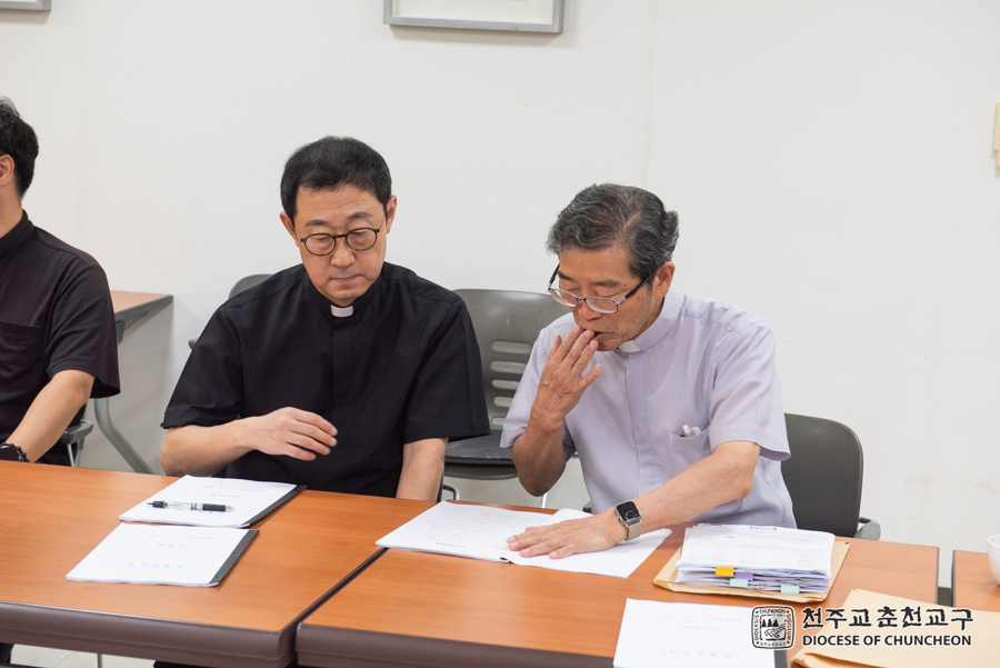 이날 12명의 정기 인사 대상 사제들중 8명이 참석하였습니다. 소임지를 이동하게 된 신부들의 업무 인계인수에 이어, 교구청 3층 경당에서 춘천주교 김주영 시몬 주교의 주례로 파견전례가 거행되었습니다. 김주영 주교는 간단한 훈시와 더불어 새 소임지로 떠나는 신부들에게 임명장을 수여했습니다.