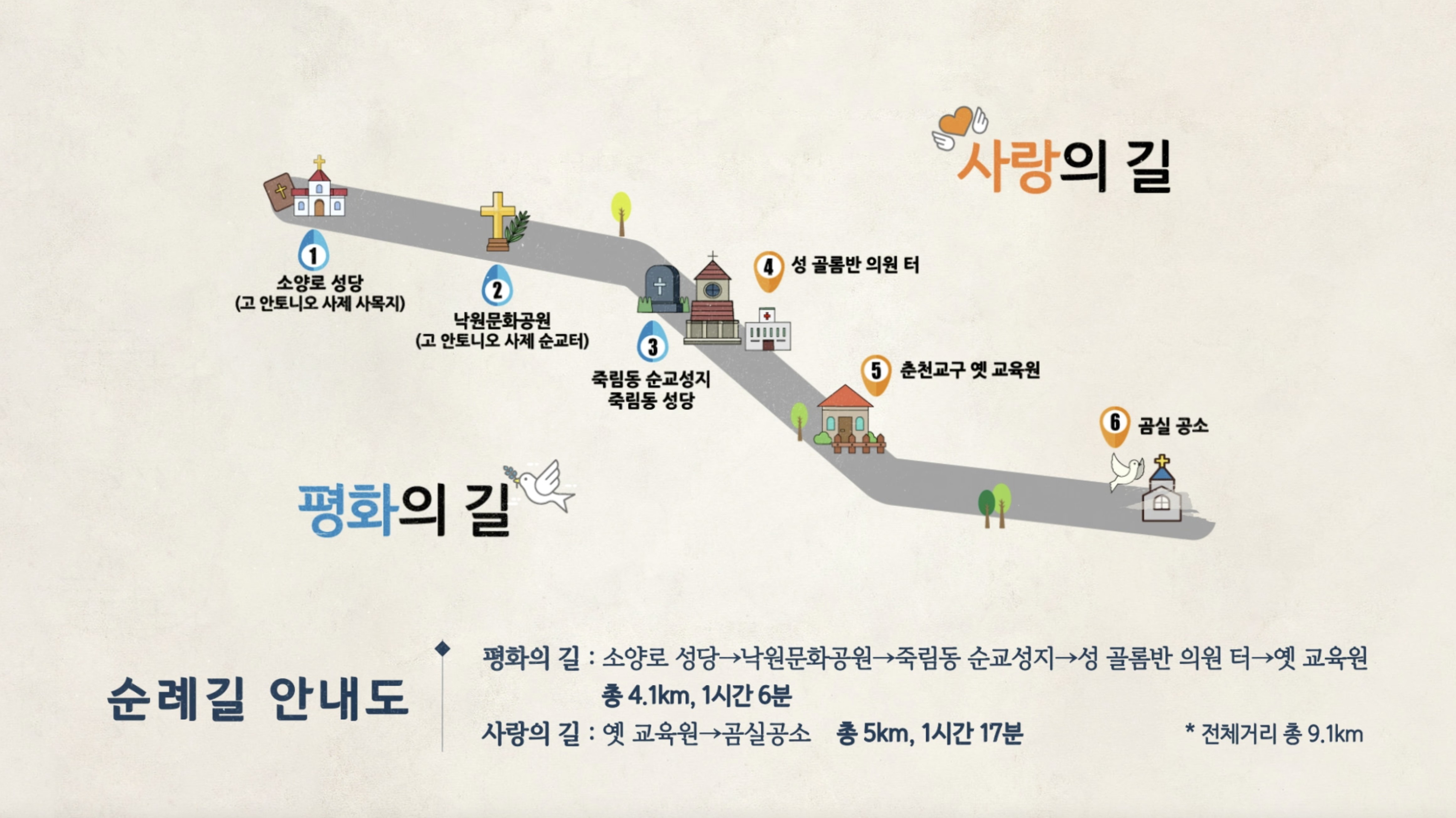 ‘평화의 순례길’은 한국전쟁 당시 공산군에 의해 순교한 고 안토니오 신부의 사목지인 소양로성당에서 출발하여, 고 신부의 순교 표지석이 있는 낙원문화공원을 거쳐 춘천교구 6.25 순교자묘역이 있는 죽림동 주교좌 성당으로 이어진다. 한국전쟁의 치열한 전투가 벌어졌던 이 길에서, 순례자들은 전쟁의 상처를 기억하며 진정한 평화를 간절히 기도한다.