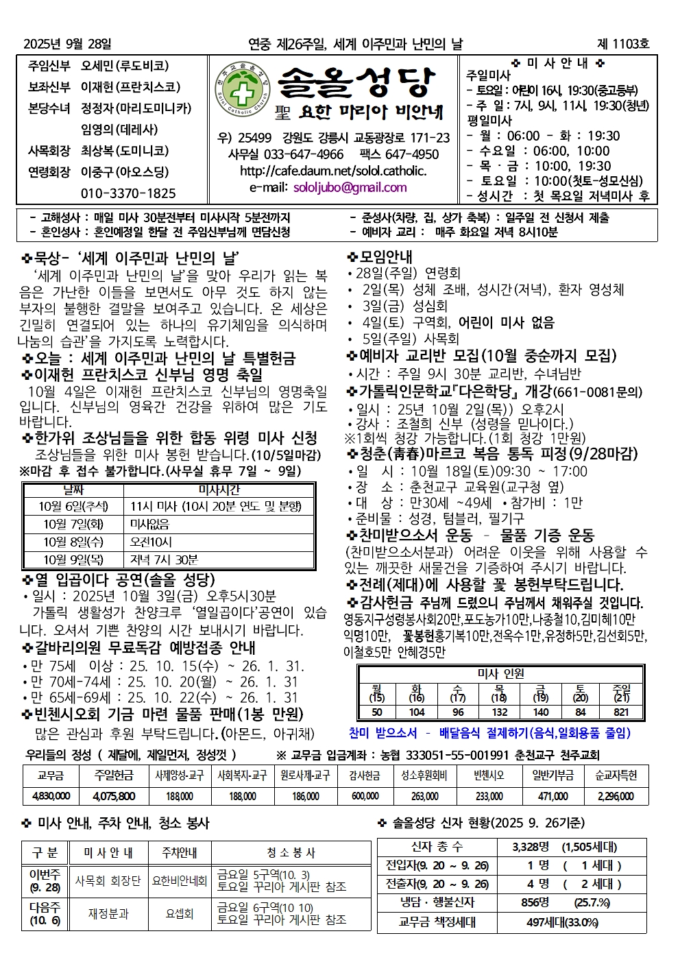 솔올 - 2025년 9월 28일 연중 제26주일,'세계 이주민과 난민의 날'