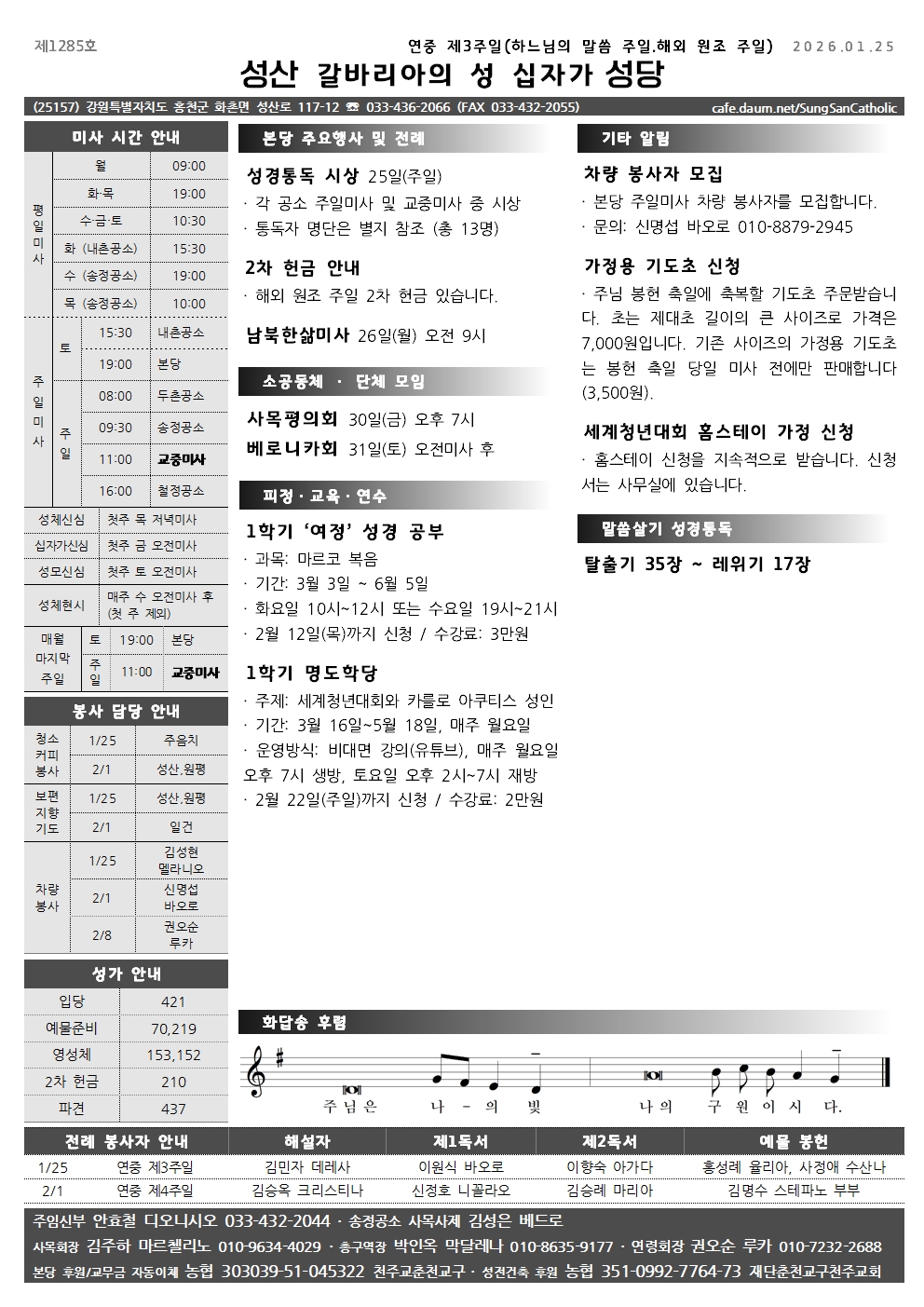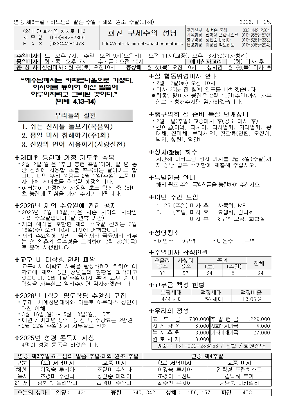 화천 - 2026년 1월 25일 연중 제3주일, 하느님의 말씀 주일, 해외 원조 주일