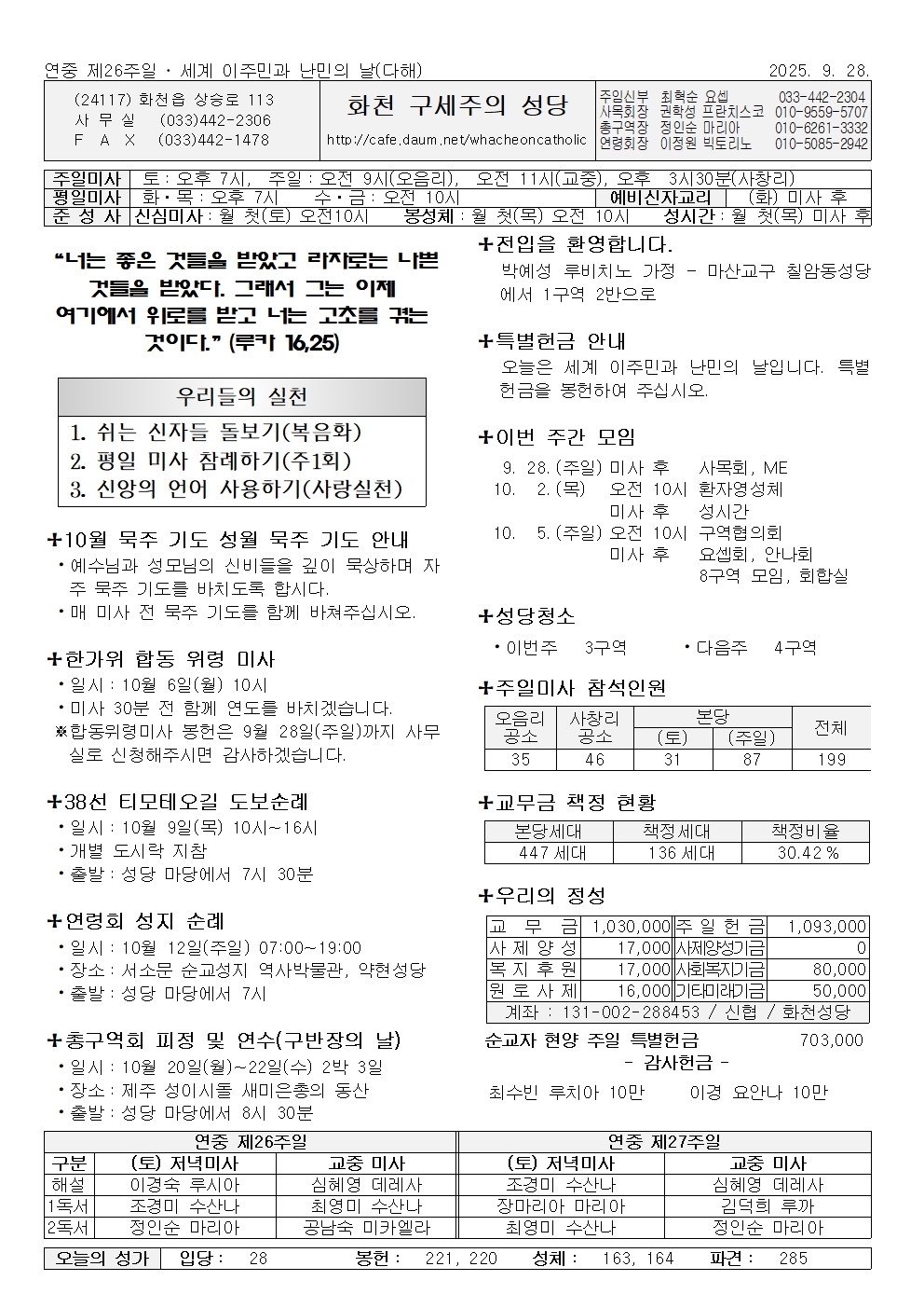 화천 - 2025년 9월 28일 연중 제26주일, 세계 이주민과 난민의 날