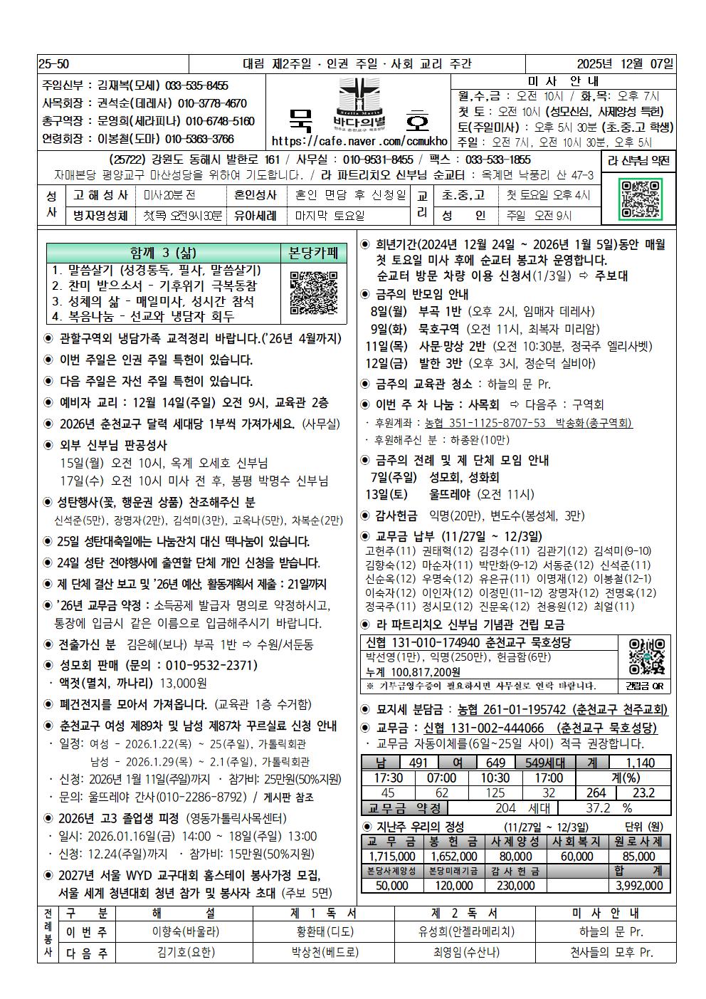 묵호 - 2025년 12월 7일, 대림 제2주일(인권 주일, 사회 교리 주간)